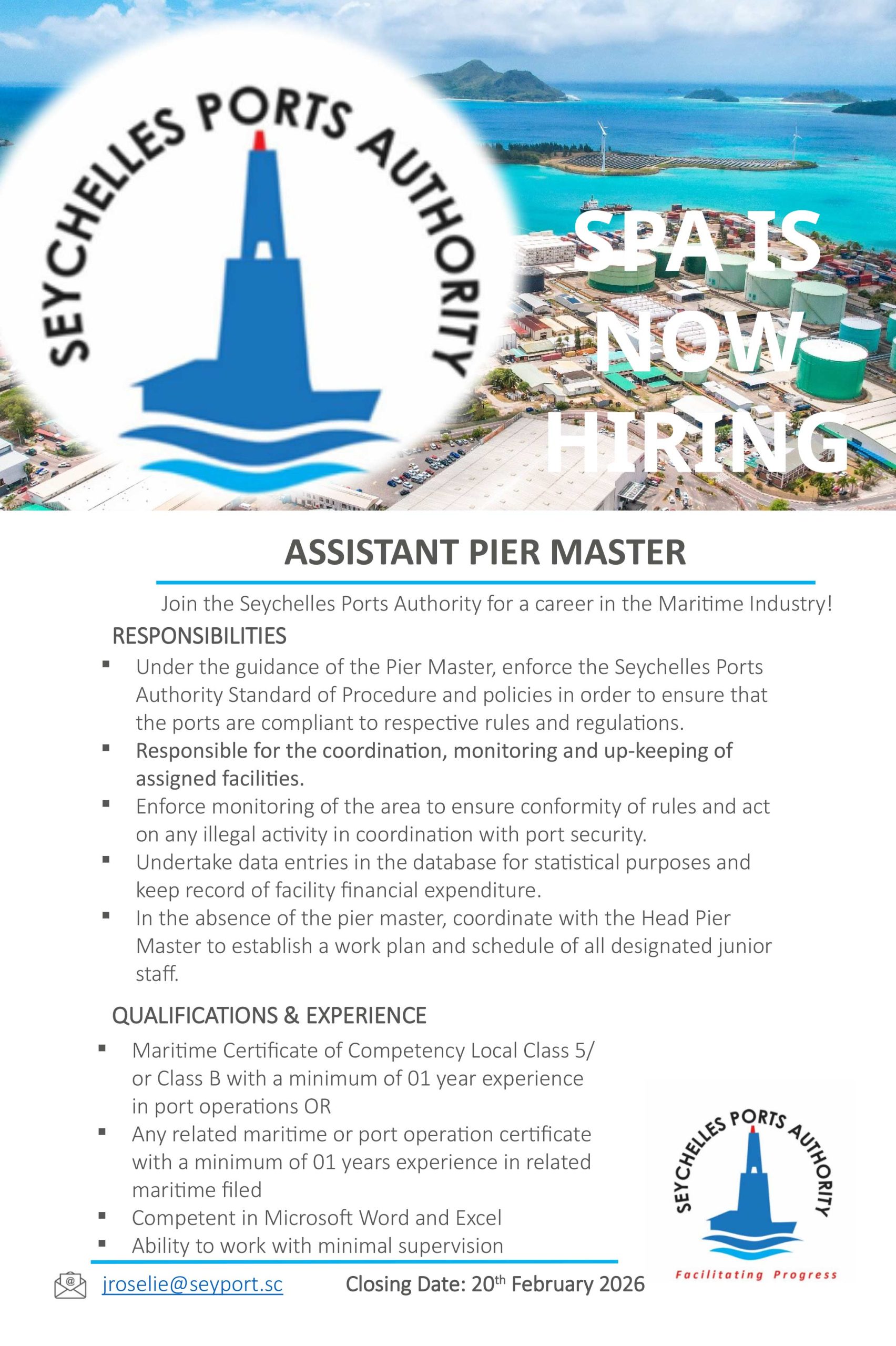 Interested candidate(s) are requested to Sign-up or login to apply now or may collect application forms at the Seychelles Ports Authority’s (SPA) Main Office, at the Commercial Port or download same on SPA’s website: www.seyport.sc.