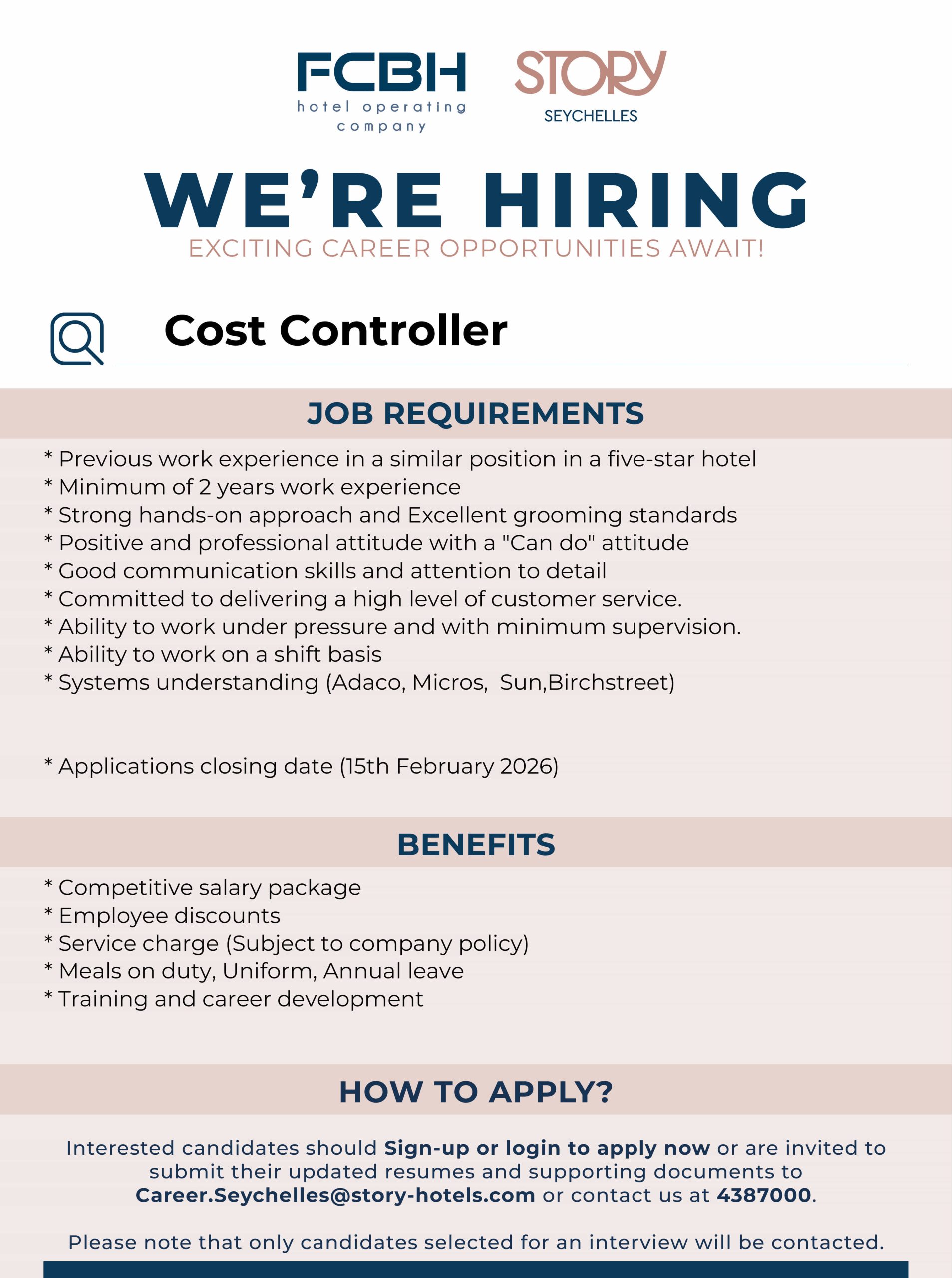 Interested candidates should Sign-up or login to apply now or send your CV and cover letter to Career.Seychelles@story-hotels.com