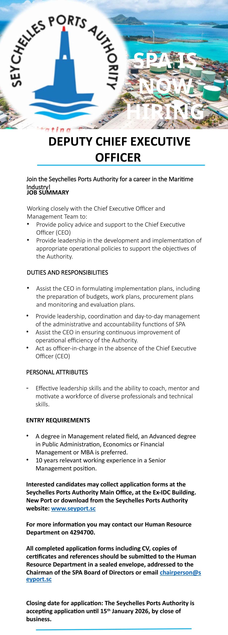 Closing date for application: The Seychelles Ports Authority is accepting application until 15th January 2026, by close of business.