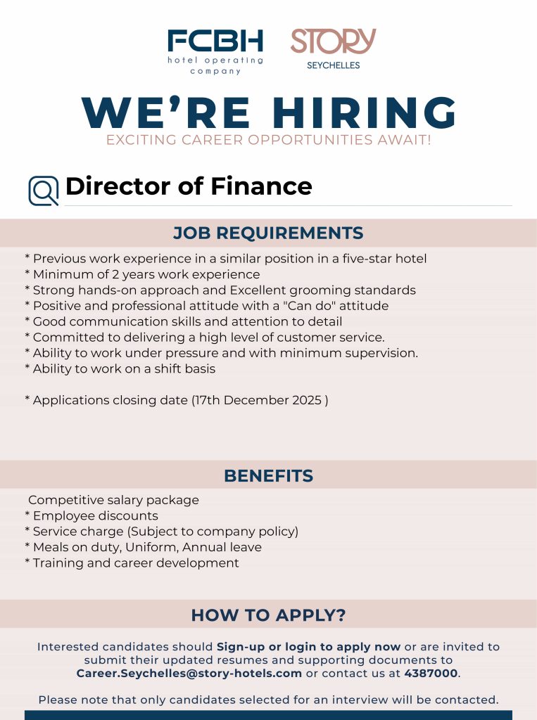 Interested candidates should Sign-up or login to apply now or send your CV and cover letter to Career.Seychelles@story-hotels.com