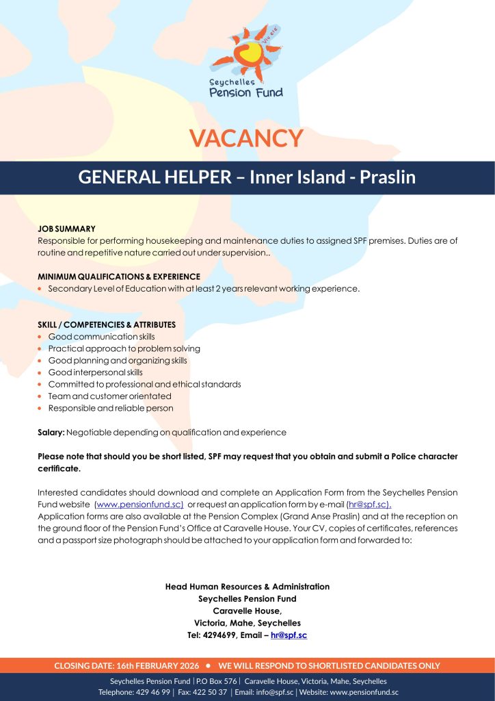 Interested candidates should Sign-up or login to apply now or download and complete an Application Form from the Seychelles Pension Fund website (www.pensionfund.sc) or request an application form by e-mail: hr@spf.sc.