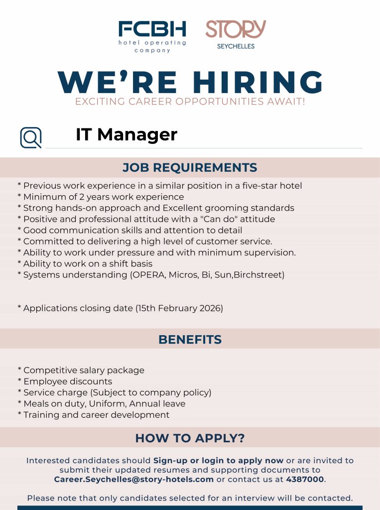 Interested candidates should Sign-up or login to apply now or send your CV and cover letter to Career.Seychelles@story-hotels.com