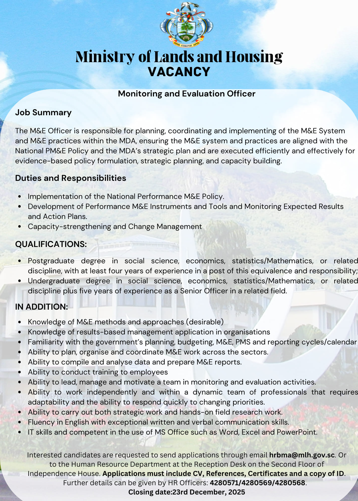 Interested candidate(s) are requested to Sign-up or login to apply now or are requested to send applications through email hrbma@mlh.gov.sc or to the Human Resource Department at the Reception Desk on the Second Floor of Independence House.