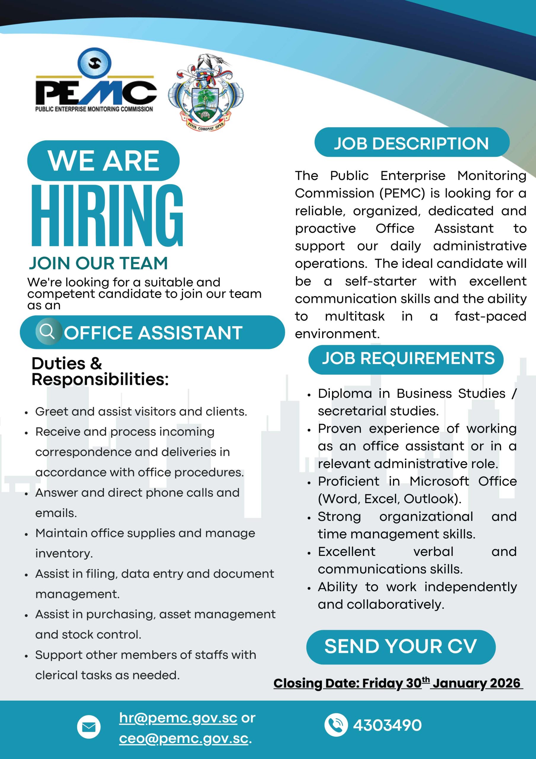 Interested candidate(s) are requested to Sign-up or login to apply now or send your cover letter, CV and other relevant documents to: hr@pemc.gov.sc or ceo@pemc.gov.sc