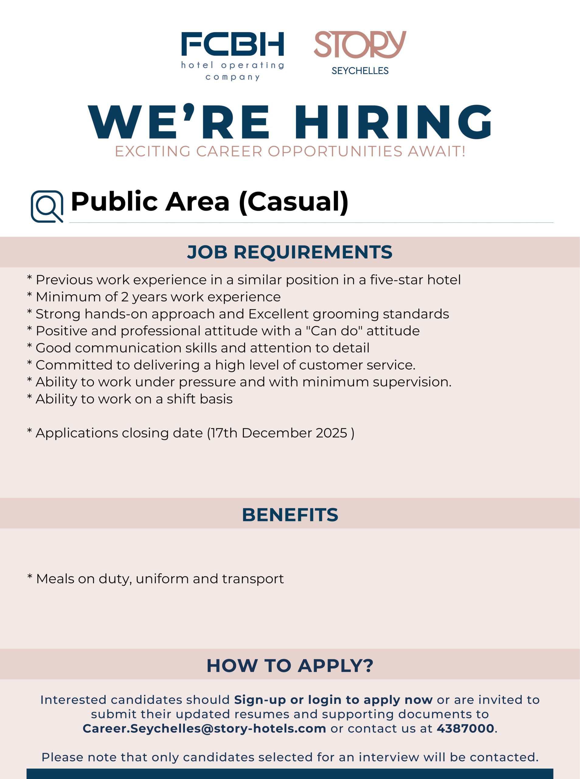 Interested candidates should Sign-up or login to apply now or send your CV and cover letter to Career.Seychelles@story-hotels.com