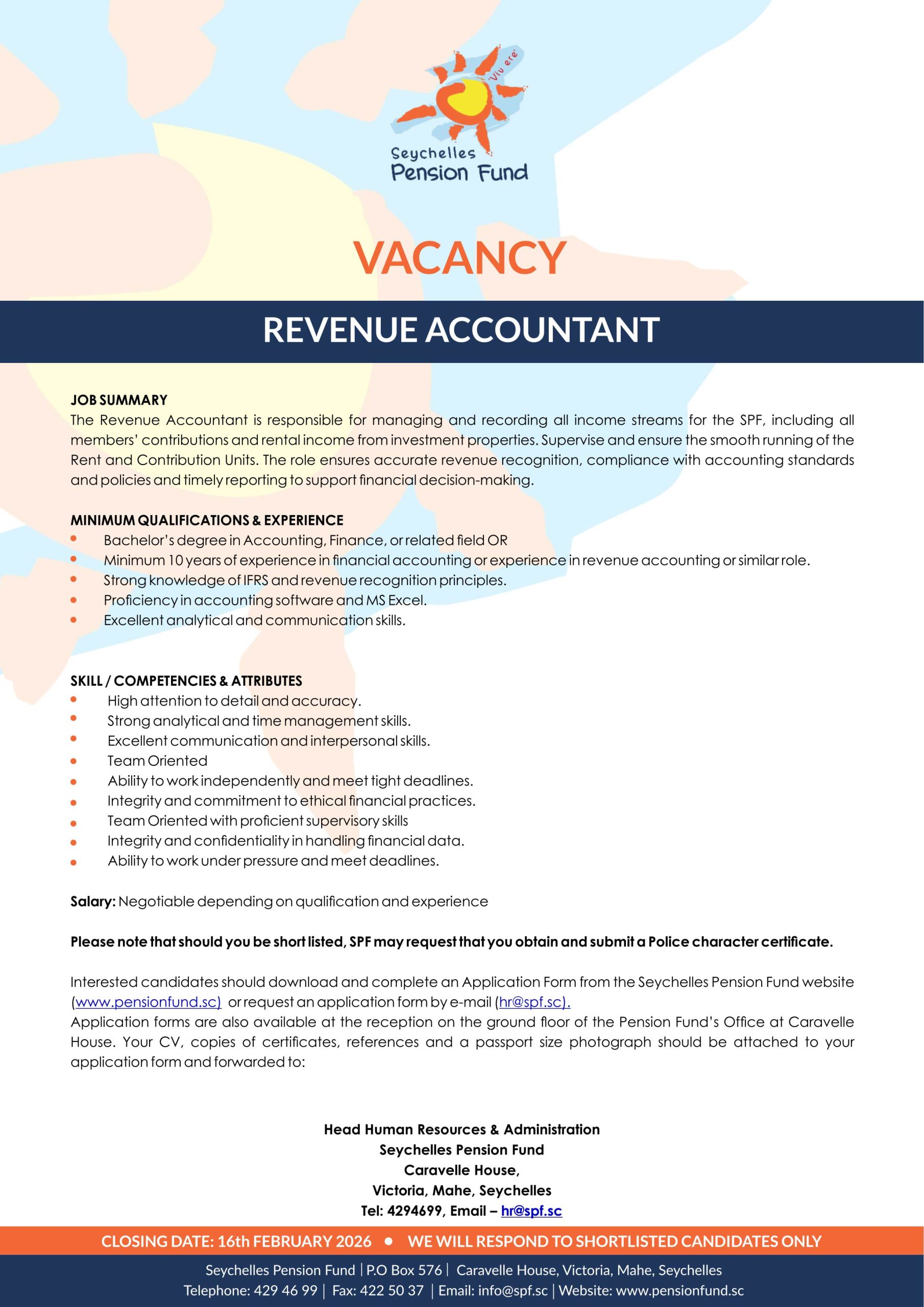 Interested candidates should Sign-up or login to apply now or download and complete an Application Form from the Seychelles Pension Fund website (www.pensionfund.sc) or request an application form by e-mail: hr@spf.sc.