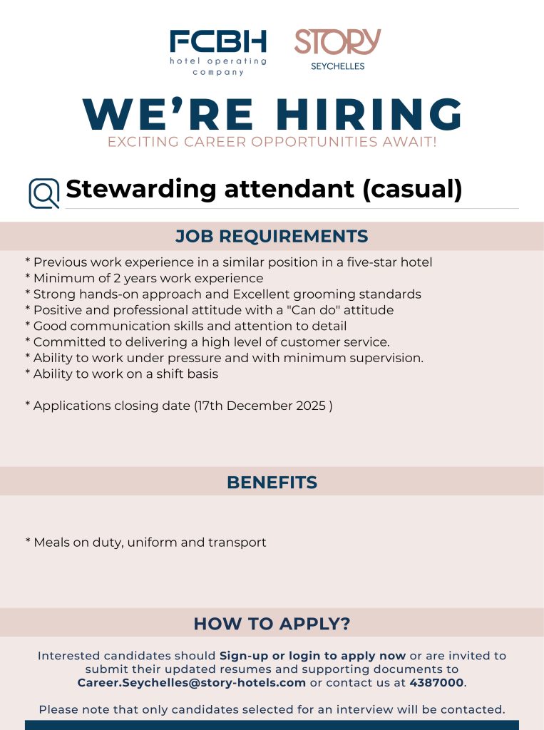 Interested candidates should Sign-up or login to apply now or send your CV and cover letter to Career.Seychelles@story-hotels.com